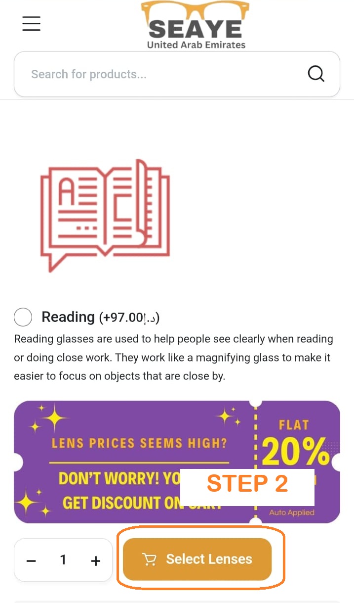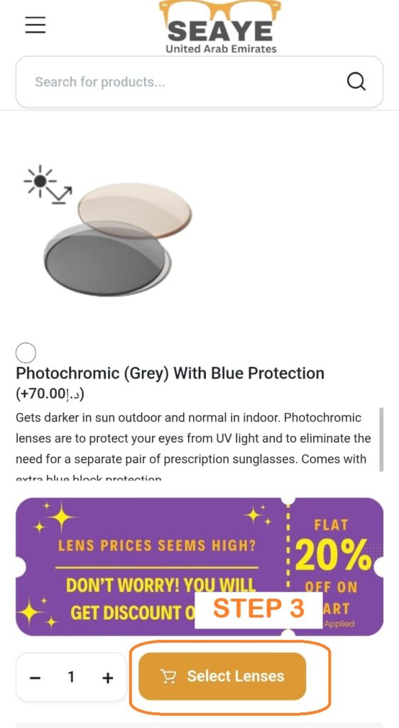 Step 2: Now you are on “Prescription Page”. You might see price of lenses are high here. But do not worry. you will get 20% flat discount on cart, which is auto applied. It will reduce the prices to same level what you seen during advt on social media. Now choose your prescription type either you need varifocal (progressive) or distance or any other prescription and click ”Select Lenses’. see picture below: